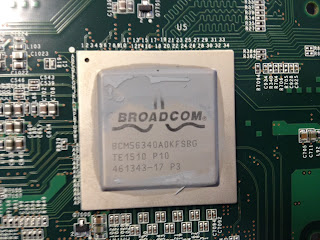 Picture of the whole thing. The CPU is a daughter card that sits on top of the main board. The Broadcom 5634 is mounted on the main board and is underneath the daughter board.